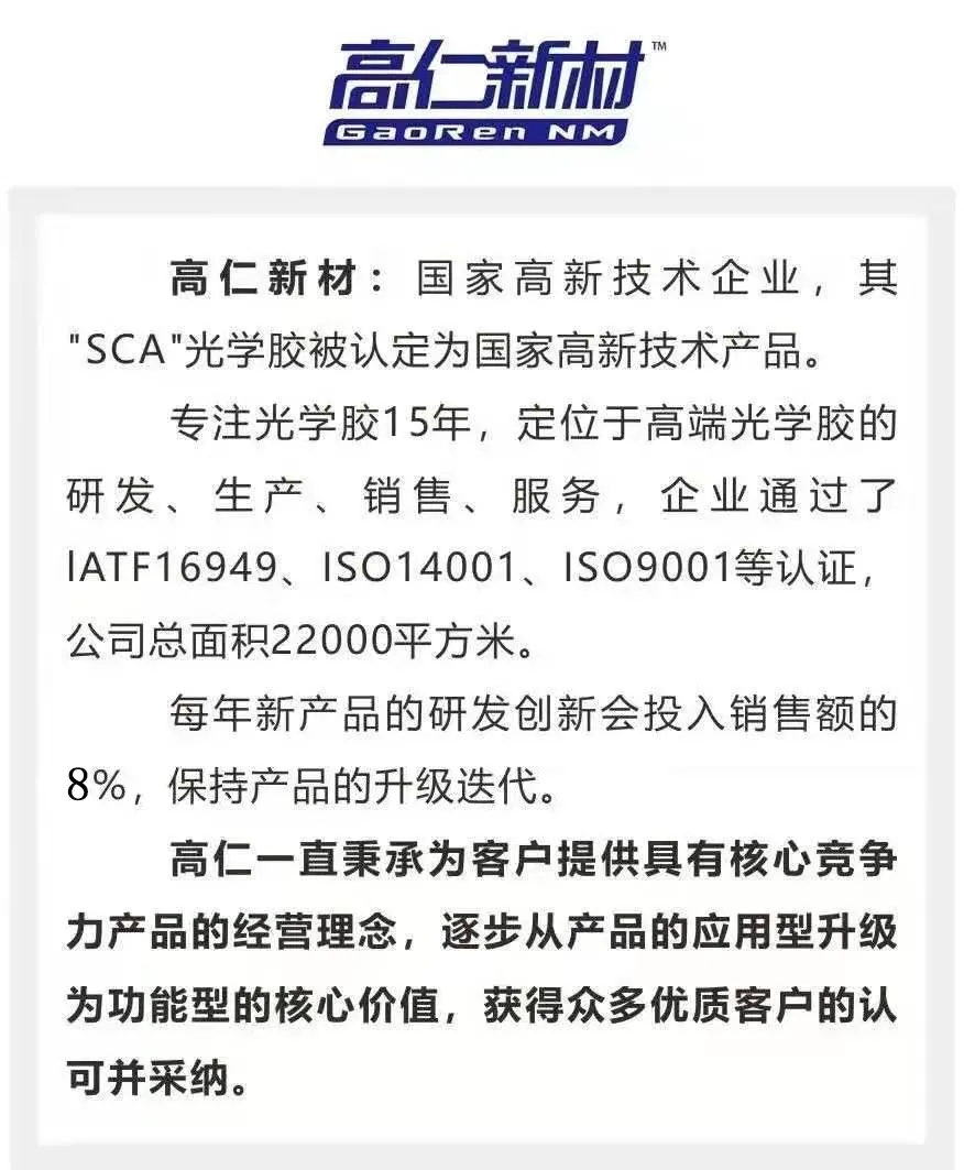 高仁新材在与车企的深度合作过程中,研发出了“一体黑SCA光学胶”材料,可以把整个智能座舱的显示部分打造成与汽车一起浑然一体的视觉观感,使产品外观更加高档、大气、美观且具有科技感,同时打造产品差异化,从而提升消费者购买欲。