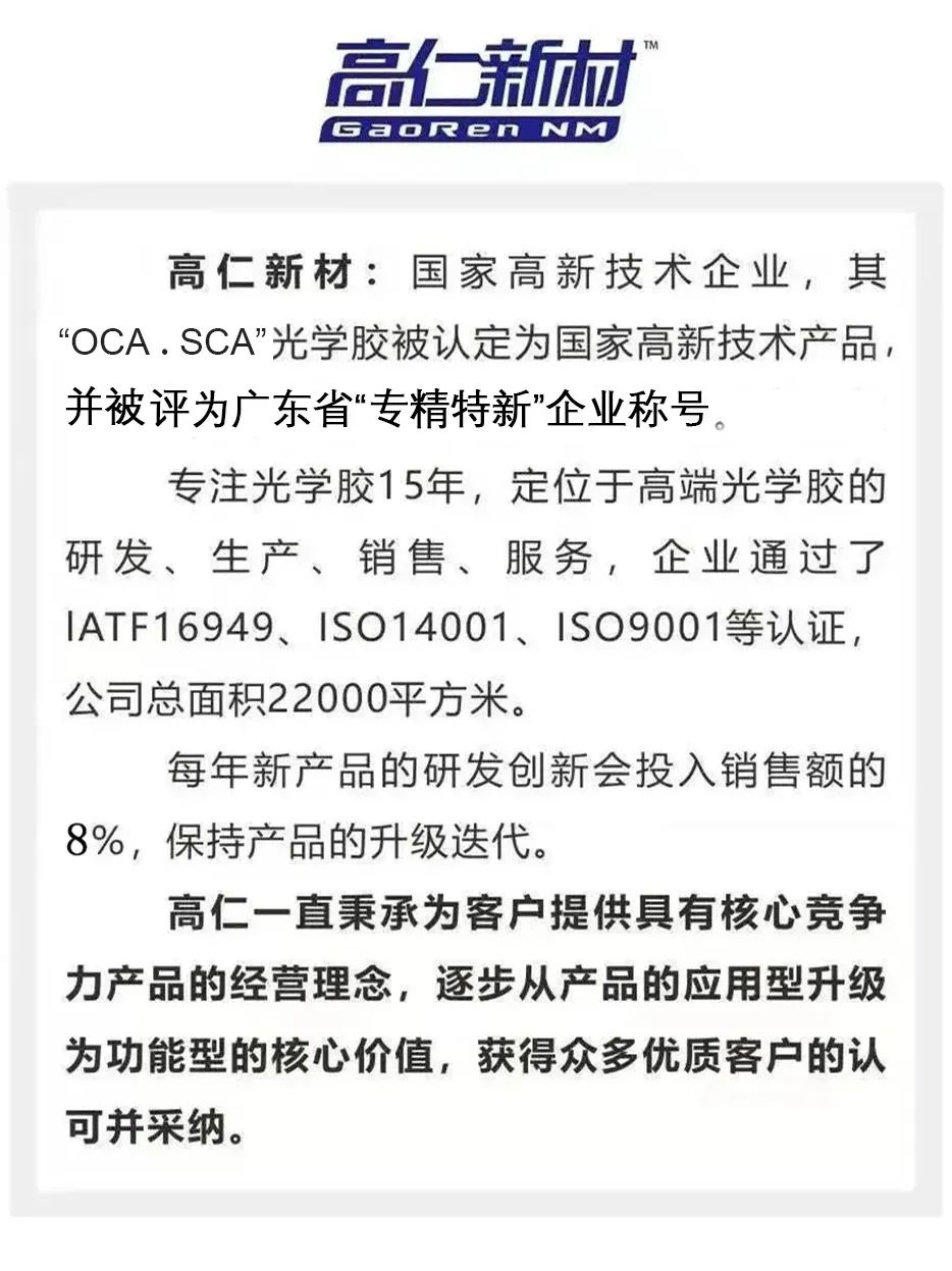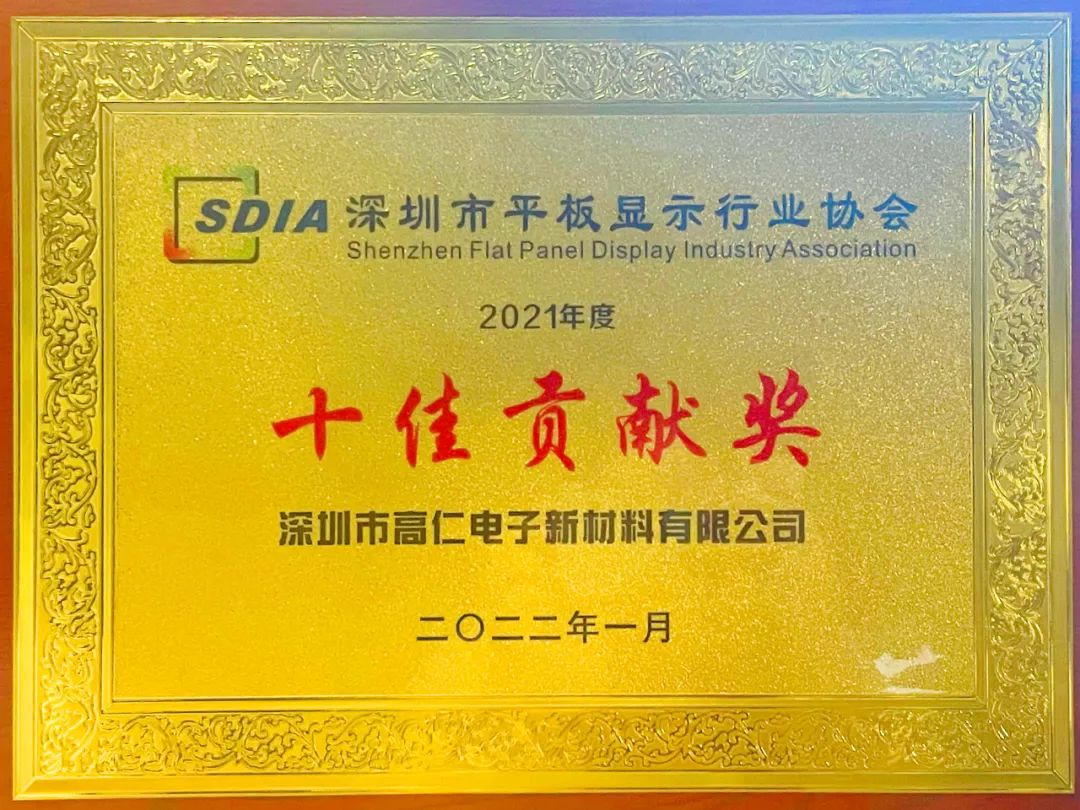 高仁新材能够获得SDIA2021年度十佳贡献奖,离不开公司全体员工的付出及努力,持续为客户提供优质的产品。首创的热熔SCA光学胶解决了大屏触控屏贴合的方案,OCA光学胶性能暂时超越国际品牌,进口替代我们要继续前行...