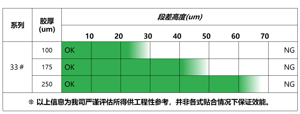 33系列是高仁新材今年重点推出的一款具有高段差填充率、强持粘性、低黄变值等特点的OCA光学胶,主要用于平面全贴合或TP贴合产品。