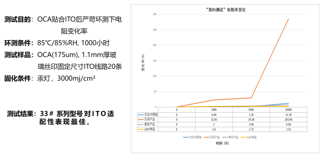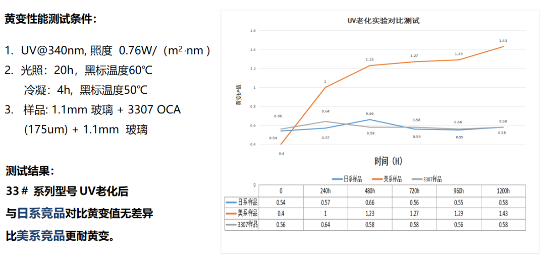 高仁新材OCA光学胶与国际品牌产品做了极限性对比测试,都是采用白色双盖板加175um OCA光学胶贴合工艺,经过QUV和双85/1000小时环测后的结果,部分测试结果如下: