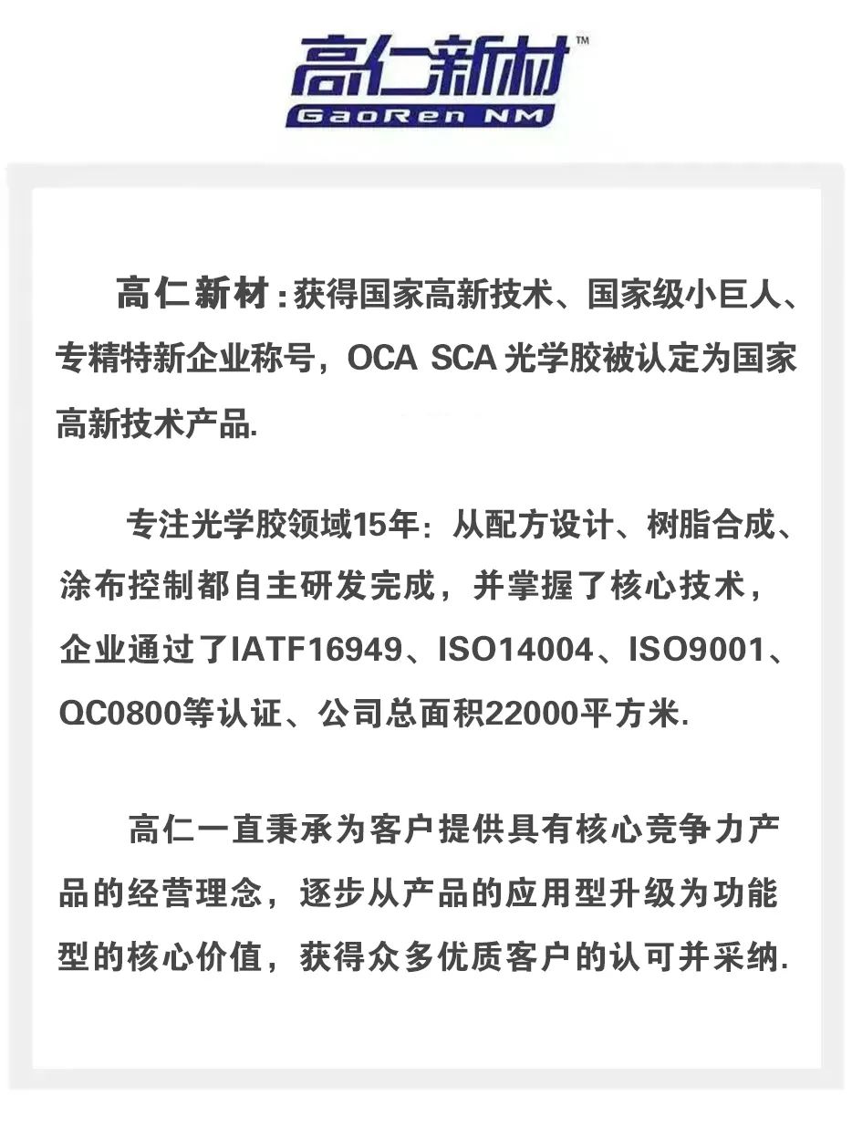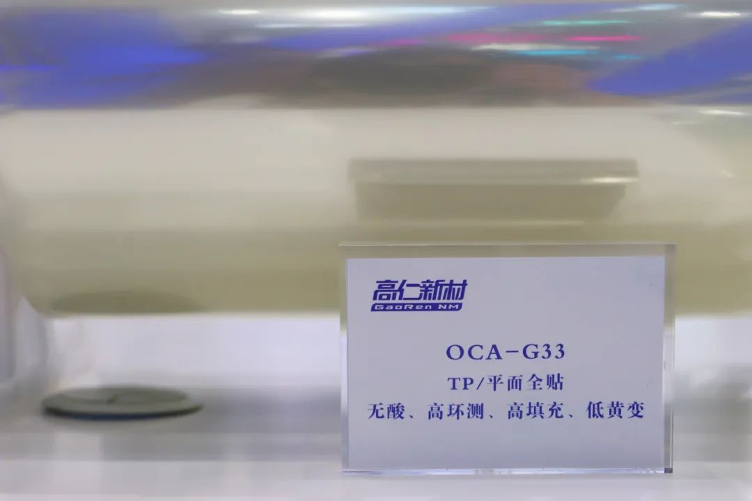而高仁新材从2017年开始通过自主研发OCA光学胶,其产品性能已达到国际领先水平,其中OCA-G33系列主要针对TP/平面全贴,具有无酸、高环测、高填充、低黄变等特性,助力触控显示行业的应用场景大幅度拓宽到户外,能满足各行各业对新型触控显示技术的要求。