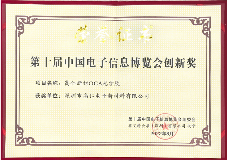 并且高仁新材OCA光学胶还获得以“奋进十载 智创未来”为主题的第十届中国电子信息博览会颁发的”创新奖“,这是对高仁自主研发OCA光学胶的肯定和激励。