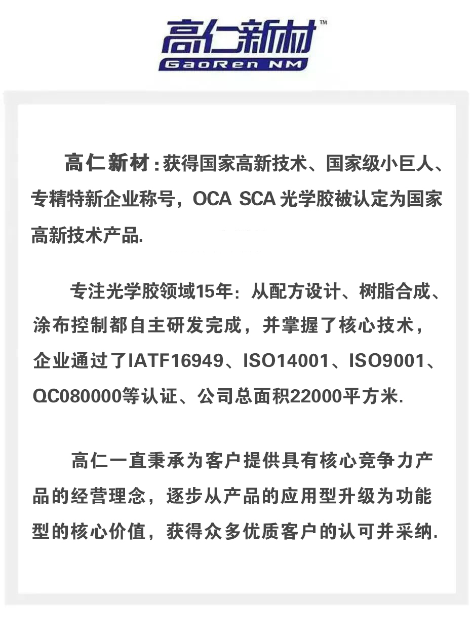 高仁新材针对大屏/超大屏全贴合产品开发了一款OCA光学胶---G93型号,该型号具有高段差填充、高环测、低应力等特点,除在中小尺寸全贴上有非常好的表现外,也能够有效解决大屏/超大屏全贴合中出现的各种问题。
